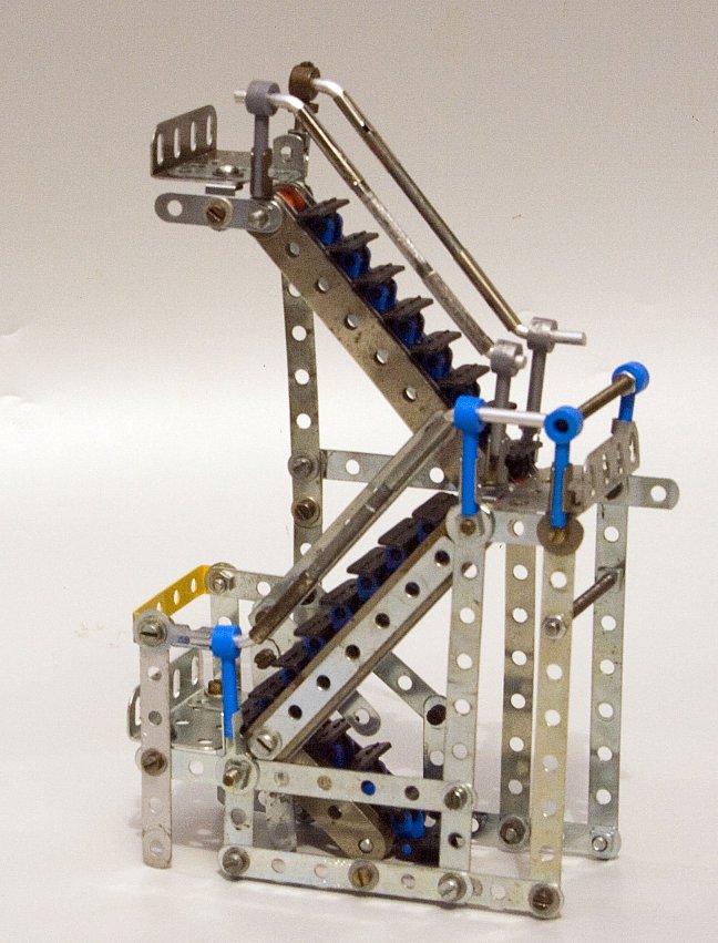 Alternate links of Flexible Track and Plastic Chain are clipped together and then formed into a zig-zag. The hinged knuckles are then held firmly between a pair of Strips of the appropriate length which are bolted to each other by Long Bolts or Threaded Rods on which a Collar or Spacer and a pair of Washers act as spacers. Outer Strips on the same Bolts or Rods act as stringers at the side of each run of stairs and it is to these that handrails and bracing girders are fixed. 2″ Girder Bracket make good landings between the three lengths of stairway.
