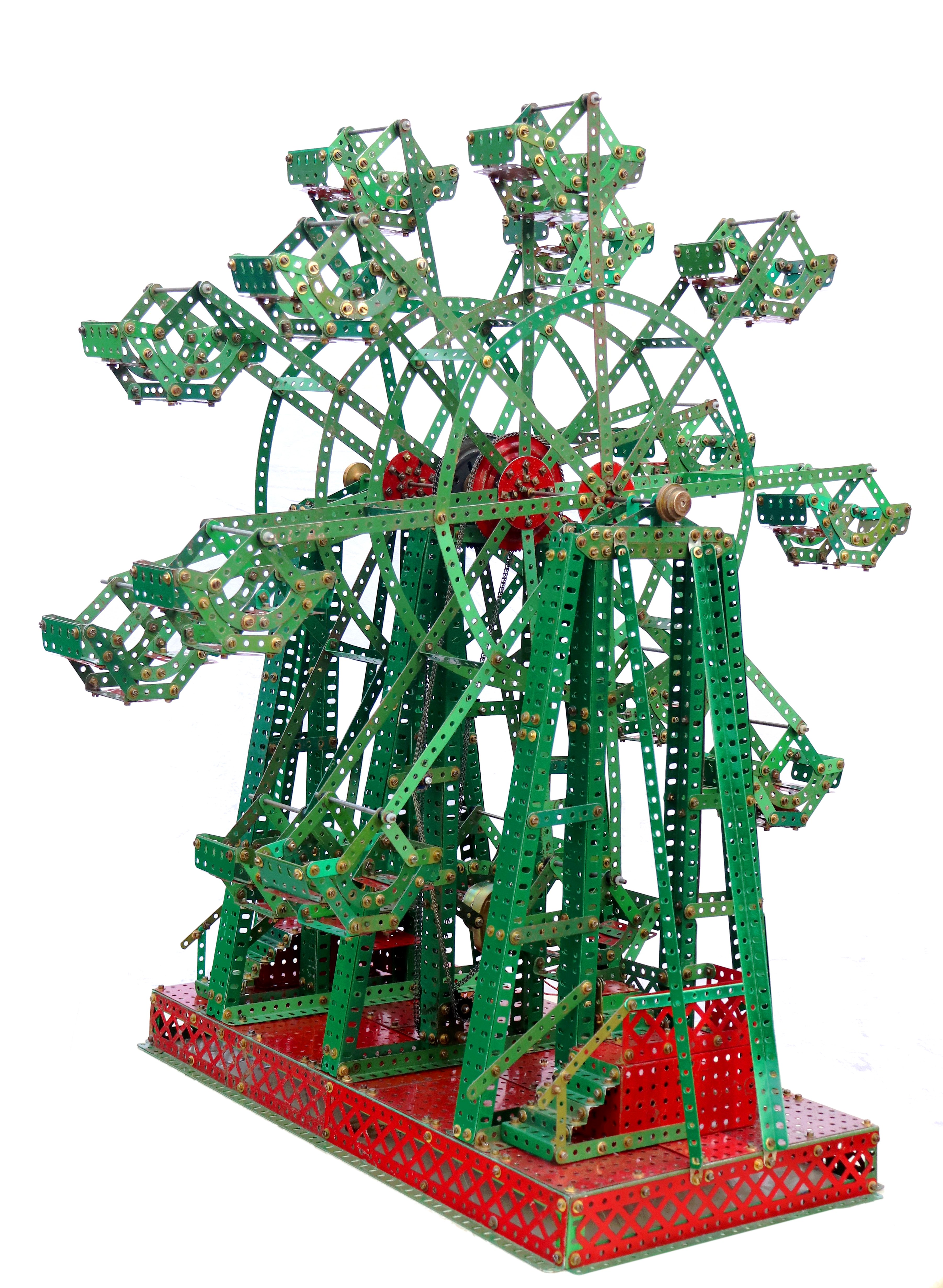 Occupying myself during lockdown, I was drawn to the impressive double “Big Wheel” fairground ride that featured in Geoff Wright’s wonderful Cavendish-series volume of old Meccano Supermodels. It doesn’t use a huge range of parts, but what it does use, it uses in quantity! Twenty-four 18½” Angle Girders, for instance, or twenty-eight in this version. The wheel rims consumed thirty-two 5½” Curved Strips, and each “boat” includes six ½” x 2½” Double Angle Strips, four 2½” Stepped Curved Strips, four 3″ Strips, four 2″ Strips, four 2½” Strips and four 1½” Strips. Common enough parts, but with sixteen boats in all that made ninety-six Double Angle Strips for a start. At current prices good parts would cost north of £750!