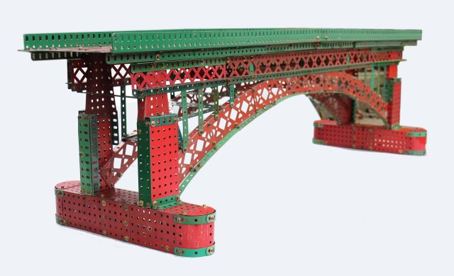 My large railway-type girder bridge was a quick original build requested as a visual aid by a church group! They wanted a design to represent the benefits of good foundations. It makes good use of Erector standard braced and curved girders as well as plenty of Meccano – the two related systems blend together seamlessly.