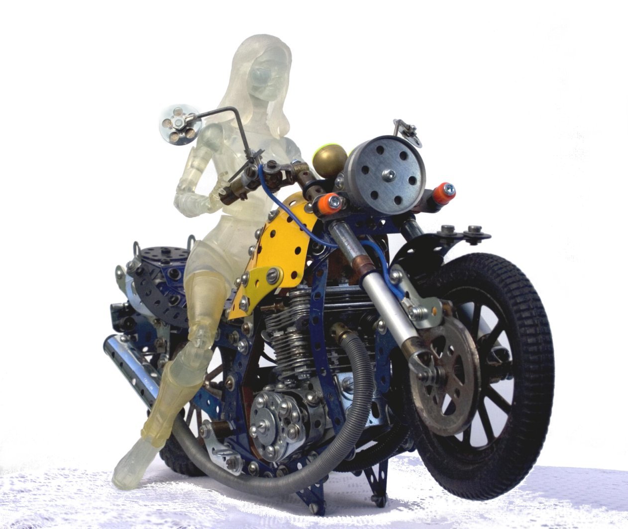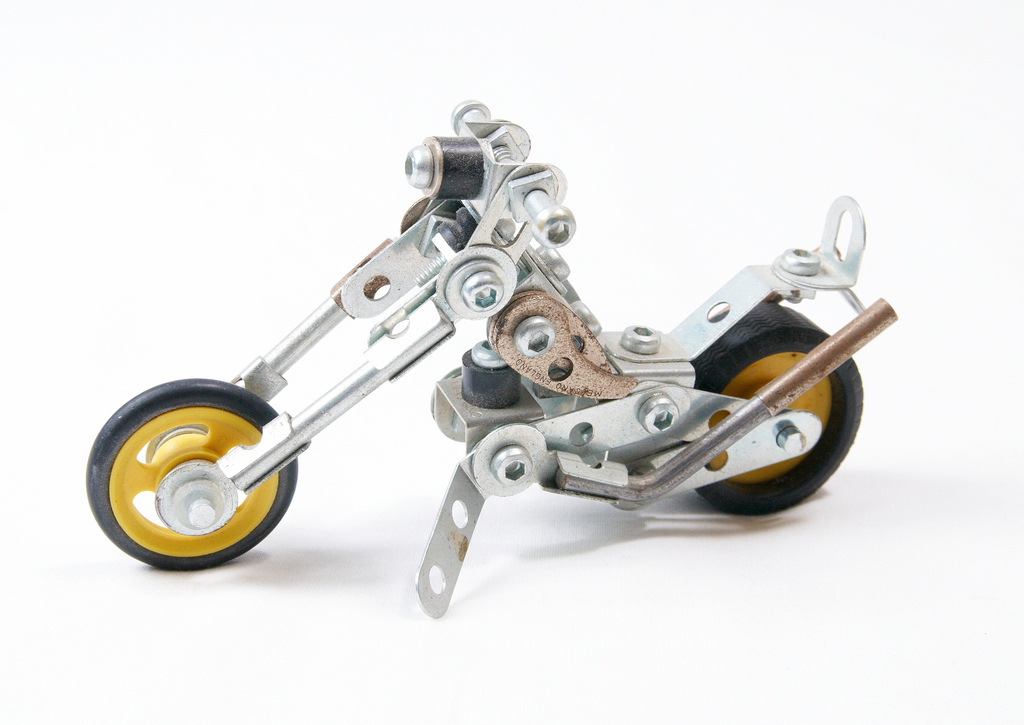 There is something about a Meccano rubber tyre that says “Motorbike“. They have never been that good when it comes to modelling 4-wheeled vehicles – they were typically low in profile and round in tread – little more than rings, really, but they did offer a whole range of possibilities for the bike modeller. Each size of rubber “tyre” has its own possibility, and in these pictures you can see a range of different vehicles, all instantly recognisable despite most being built from a relatively small number of parts.