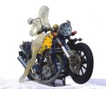 In this smallest model shown here, 1/2″ tyres are used and you can see the long front forks, “ape-hanger” handle bars, a “Harley” style tear-drop fuel tank, a “King and Queen” seat and swept-up “chromed ” exhausts typical of a “Chopper”.