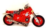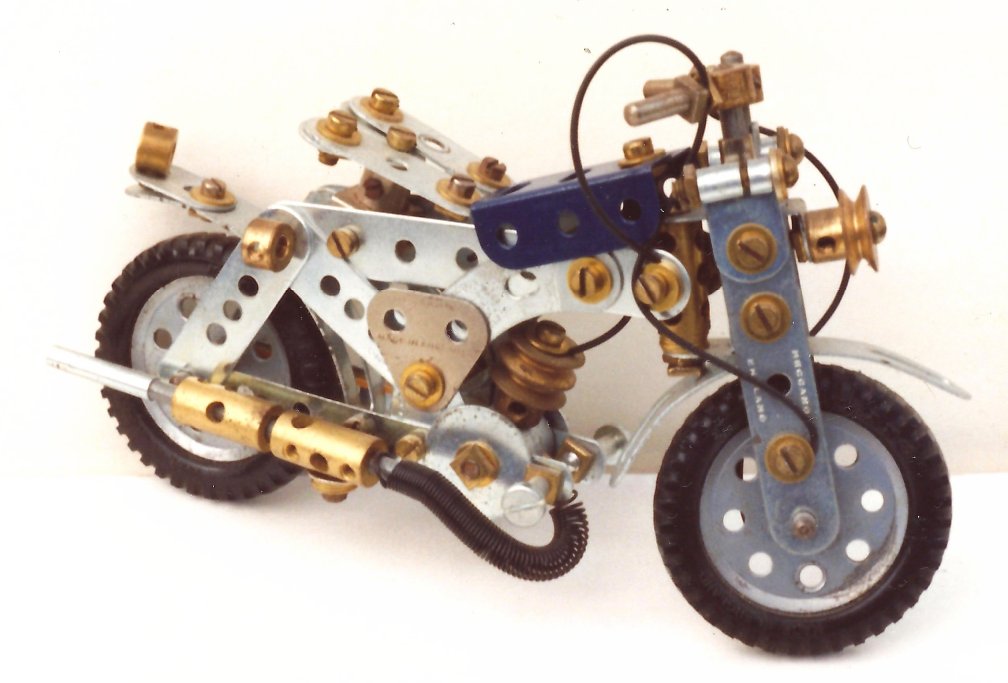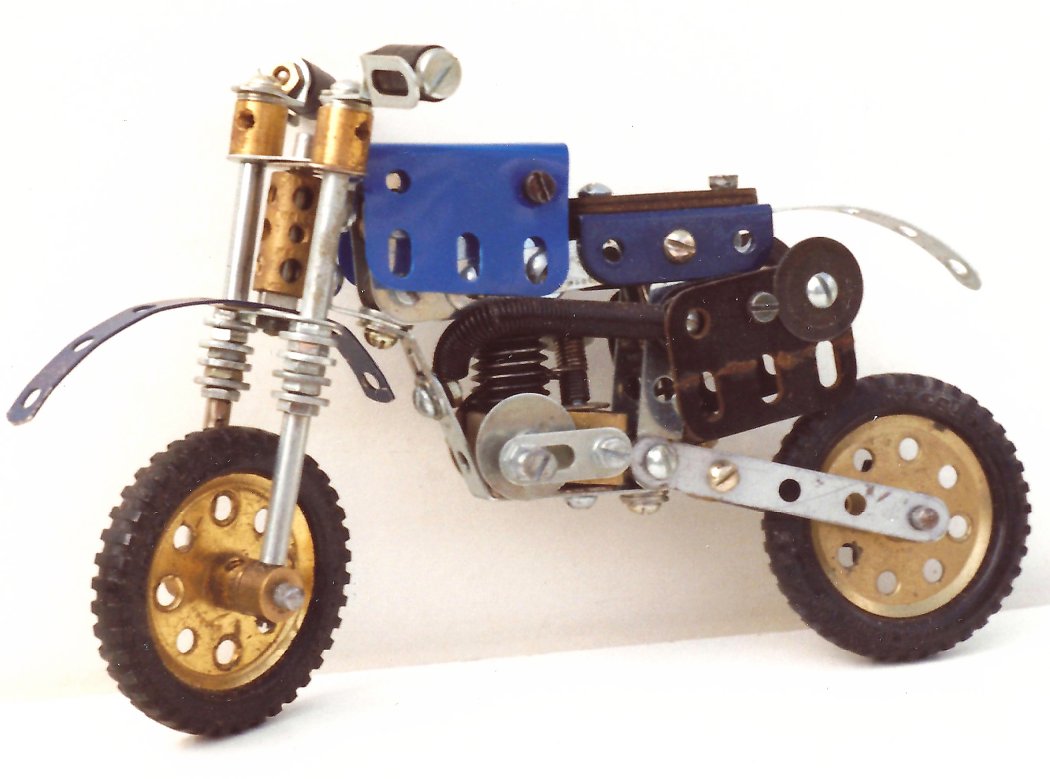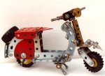 Many years ago I produced another set of four bikes taking up ideas from the Meccano Magazine which again show how many different models can be reproduced. Here you have another simple but effective model of a circuit-racer produced by BRAL, a Meccano clone. I actually bought this at the Brands Hatch racing circuit! Then there are models of an Italian Scooter from a Meccano Magazine picture, and a small moped and a motocross bike, both from the columns of old Meccano Magazines.