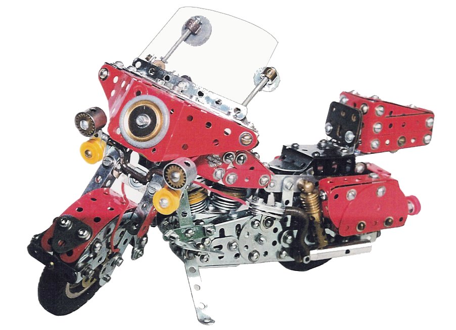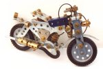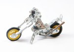 The next size up means using a 2″ Pulley and tyre – in this instance I have actually used the Stokys equivalent to produce a model of a Harley Davidson Electraglide. By now you can see all the characteristic elements of a Harley appearing – tear-drop tank (of course), a twin cylinder air-cooled engine, side panniers and top box, front fairing, light bar, instruments and hand-controls, etc. Not so much an Electraglide in Blue as in an Electraglide in Meccano red, of course! This had its beginnings in a kit one of the European clone systems, but it was full of custom plastic parts and had wheels that were half the scale of the body! So I set about building my own version to see what Meccano could do by way of a response.